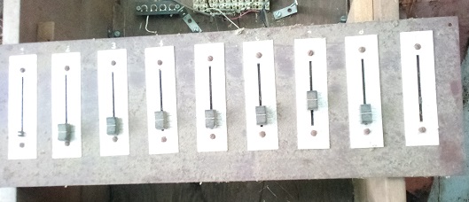 This poor quality photo shows (kinda) the very FIRST fader panel of that very first mixer build back in 1970. It was a bit crude compared to subsequent efforts but workable nonetheless. I just couldn't bring myself to take this little piece of DaviSound history to the ''junk heap'' even as weathered and worn as it is.
