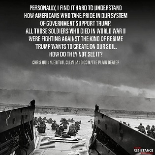 In worst case, can it mean that you actually indentify with this crowd and WANT to live under, and be a part of, an Authoritarian regime? This is becoming more and more likely than many of us can fathom I am afraid. If that truly is you, then you and I have a REAL problem! My Father fought and risked his life in every major European battle of World War II from Normandy to Bastogne (5 major battle stars to prove it) to fight FASCISM! That is one of the many reasons I feel obligated to continue this fight for him now! I will NEVER stand by and watch our country taken over by fascists without speaking out against it with all I have in me. It's that simple! I invite, and URGE EVERYONE, WHATEVER your ''political persuasion'', to unite and to stand with all of us AGAINST this facists takeover!