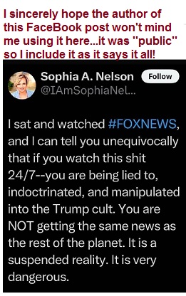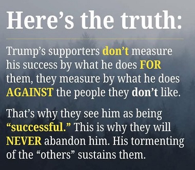 But back to the point of context. Do I think that ALL Trump voters should be categorized as ''cultists''? NO and I have NEVER said or implied that. I have said that I have spent far too many hours pondering and wondering HOW ANY reasonable person could still support what is happening to this country NOW under this regime and, like so many others who care, try to determine the reasons for it. One that I have covered ''ad nauseam'' is propaganda and I still believe that this is the main reason. But, some of the feedback I have gotten from ''Trumpist converts'', which I cherish by the way since their ''conversion'' is part of what makes my humble efforts feel worthwhile, has caused me to see and consider other reasons.