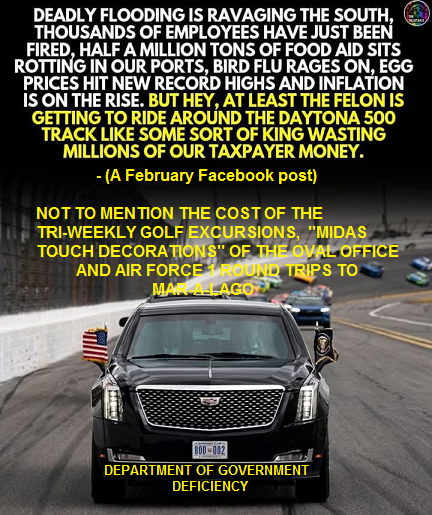 Trump promises to be investigating waste and fraud in the government, yet he’s fired the expert watchdogs who did exactly that. Meanwhile his own wastes and fraud run rampant- including the '' Midas Touch'' gold trappings to the oval office....just wait until you see his planned military parade and 4th of July festival! Trump's personal transportation and personal security costs FAR exceed any former President in American history and most of them are entirely whimsical and unnecesary! Musk scraps children's food and health programs while enriching himself with new fat multi-billion dollar government contracts... efficiency? ... of course... for Musk and chronies.